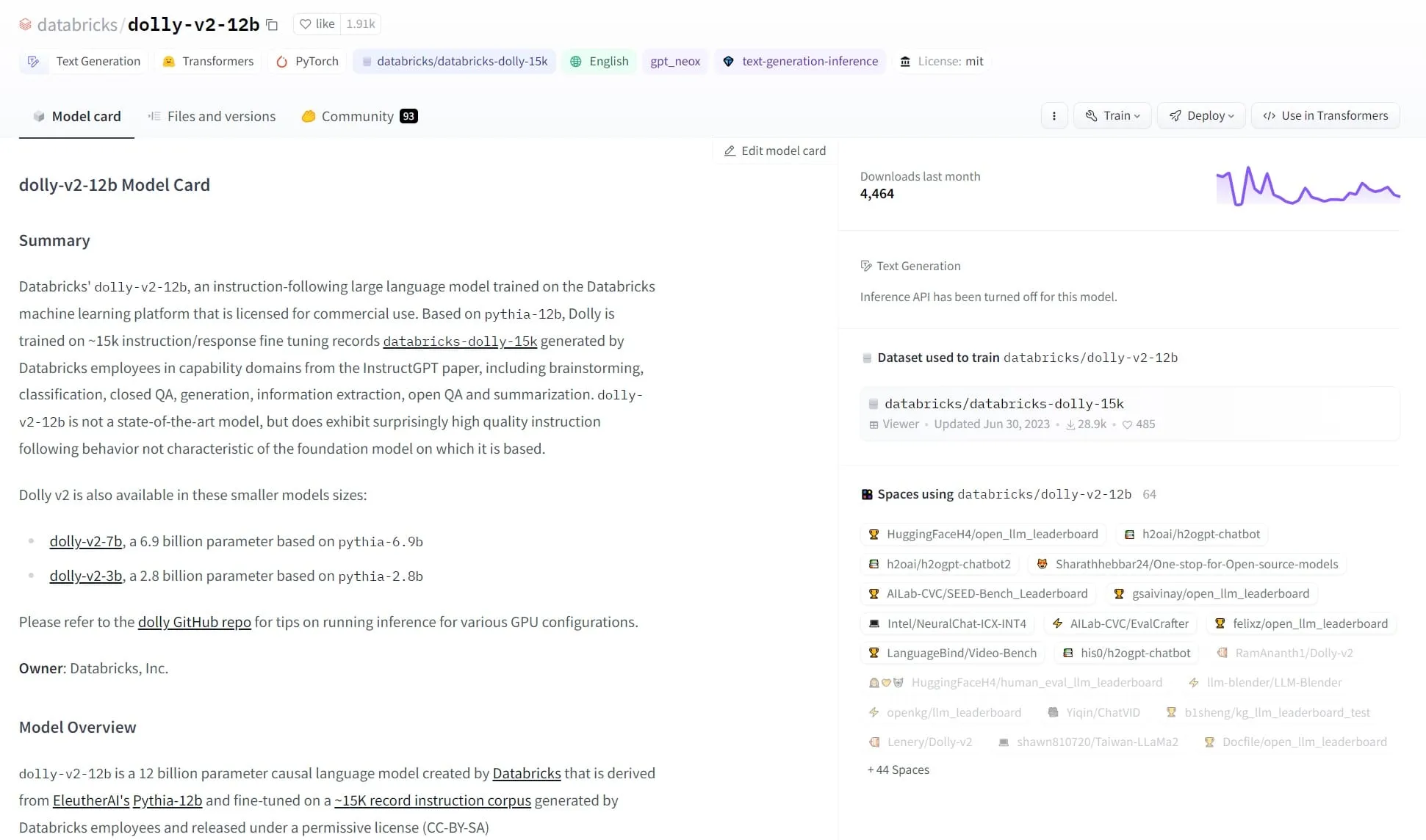 Dolly 是另一个在 Databricks 机器学习平台上训练的语言模型,并已获得商业使用许可。