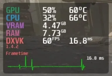 借助 MangoHud,你可以得到一个信息层,显示 FPS、CPU/GPU 的温度、显存使用情况等信息,这与在 Windows 下利用英伟达 GeForce Experience 或者 MSI Afterburner 的效果相似。