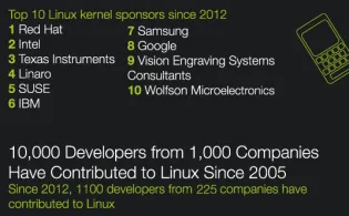 在Linux的贡献者排名中,Google 2009年的时候还只排在第19位,今年已经从第10位上升到第8。前三名的公司依次是:红帽(Red Hat)、因特尔(Intel)和德州仪器(Texas Instruments)。