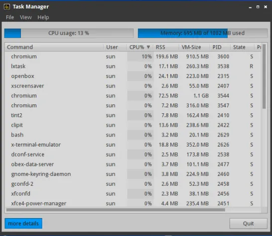 另外一个是“任务管理器”。目前绝大部分Linux发行版上都已经配备了标准的图形化任务管理器,很高兴在一款以KISS原则设计的Linux发行版上,我们同样也能看到。