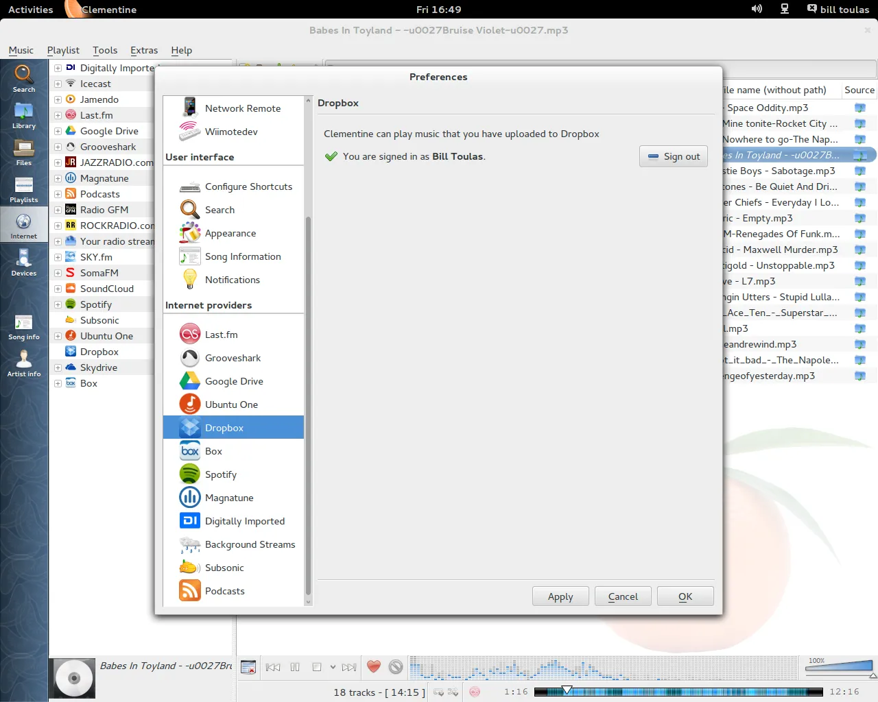 公告中这样描述“Clemntine 也添加了对Subsonic的支持。现在你能听存储在Box、Dropbox、Skydrive和Ubuntu One中的音乐了。最后一个要说的主要新特征是能够‘标记’你的播放列表,因此你能够从左侧工具条上新添加的播放列表条目中安全地关闭以及恢复它们”