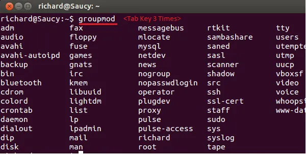 查看Ubuntu上所有的组,键入命令groupmod并(连按三次tab键)