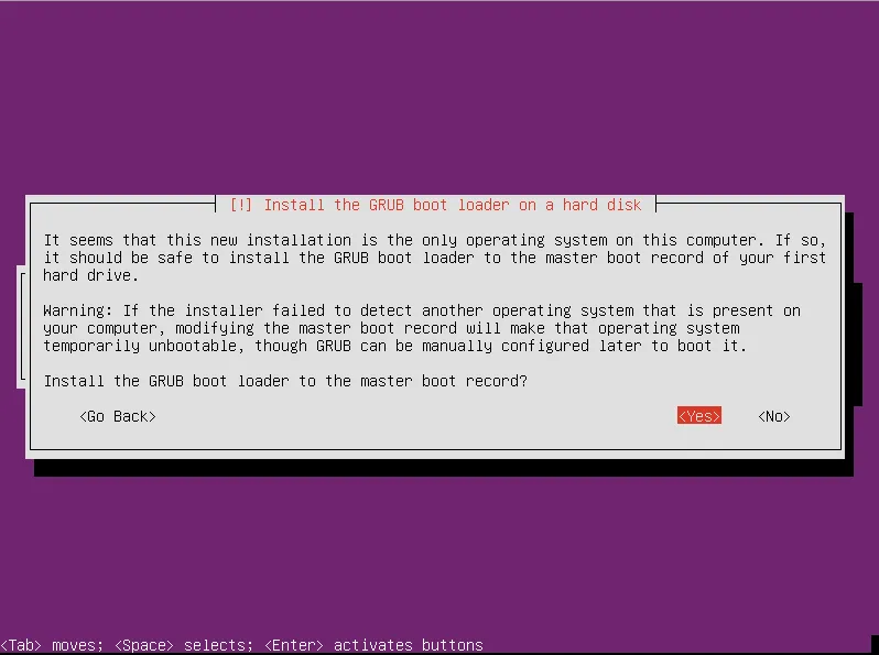 点击Yes安装Grub引导装载程序(译注:这里一般没有别的选择,肯定是安装Grub,除非你有特别的理由给服务器安装其他的引导器。):