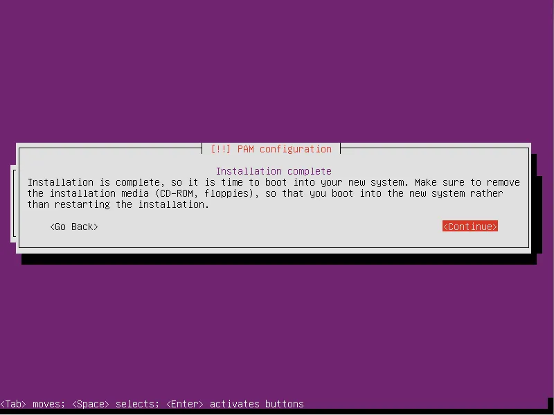 安装完成以后,选择continue重启服务器即可: