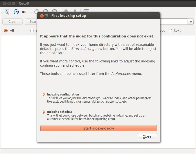 第一次启动时,你需要索引整个home目录。依据你 home 目录里储存的东西的多少,需要的时间不等。按下Start indexing now按钮开始索引。