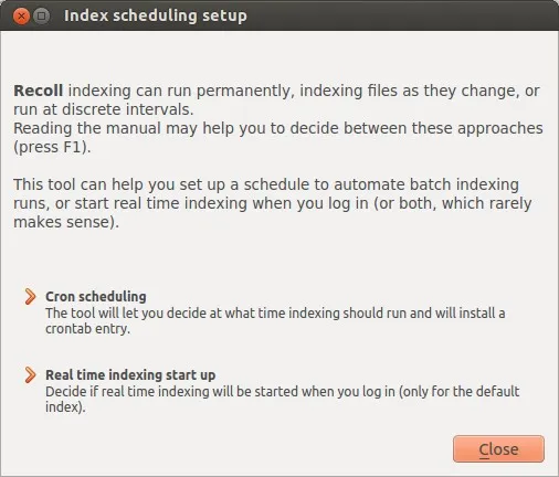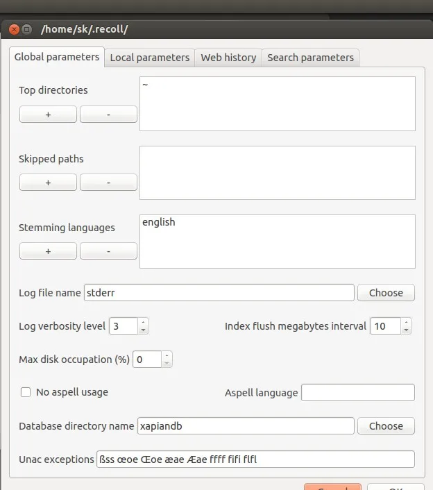 正如上面提到的,假如你想更多的控制索引的细节,你可以调节Recoll的索引功能。 在Recoll的工具中有两个配置项