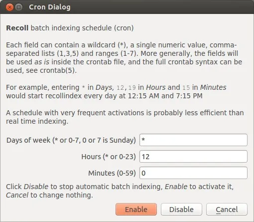 以上这个屏幕截图中,Recoll的cron任务会在每天上午12点的时候执行。设置完cron任务后,点击enable键激活它就可以咯。
