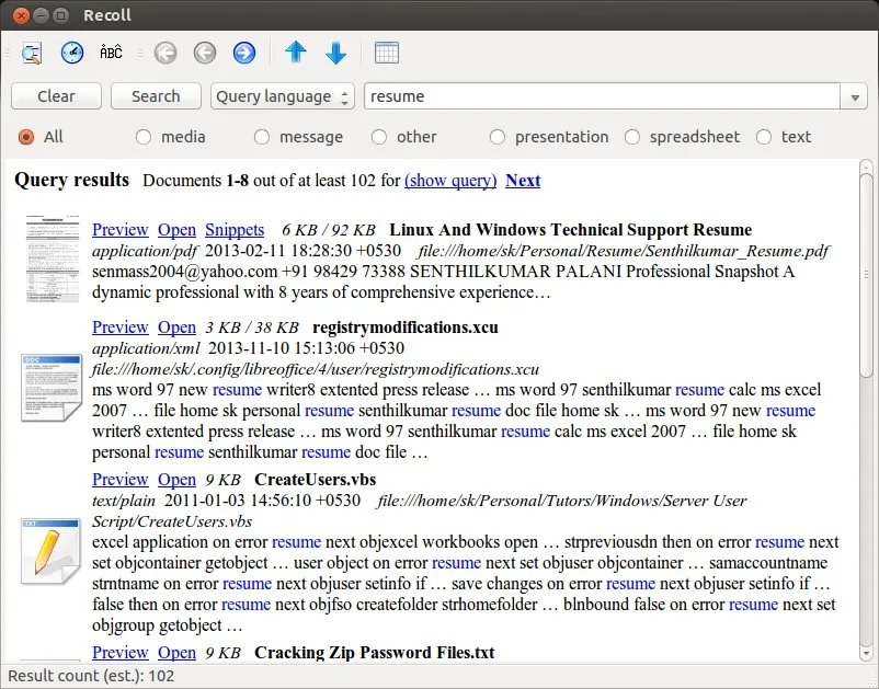 现在你已经对Recoll了解的足够多了。是时候去搜索一下文件或者文件夹了。这个应用的美妙之处就在于它既可以搜索文件名还可以搜索文件内的关键词。