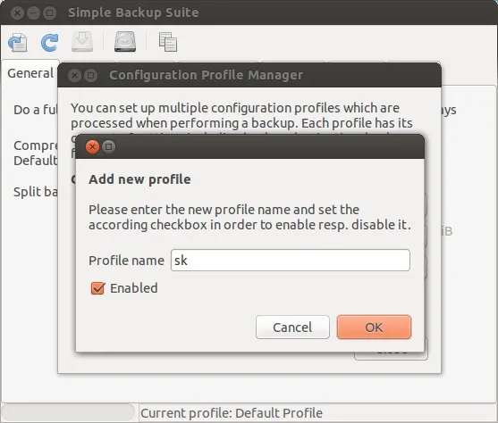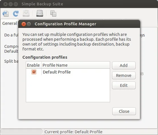 最初的 SBackup 没有任何用户自定义的配置文件,只有默认的配置文件。需要注意的是,用户不能删除默认的配置文件。若要创建一个新的配置文件,点击 Tools -> Profile Manager,将看到如下窗口
