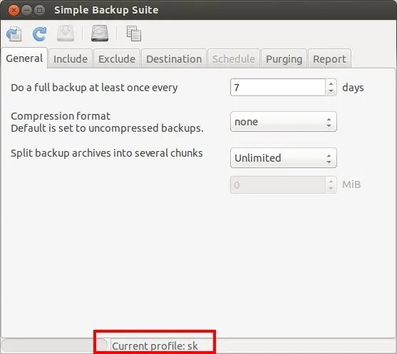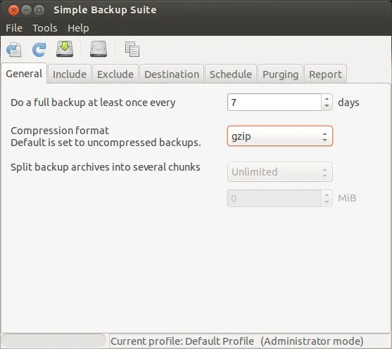 在 General 选项内,你可以选择多久进行一次完整备份,默认是7天。每7天 SBackup 将会进行一次完整的备份。你也可以选择备份的压缩格式。
