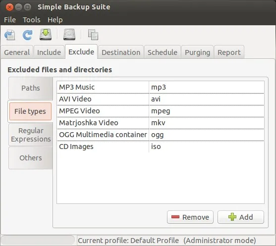 更进一步的是,你可以增加备份时排除文件的类型,像 mp3 和 avi 等等。在默认配置下,mp3, avi, mpeg, mkv, ogg 和 iso 是被排除不被备份的。如果你想备份这些文件,只要选中然后点击 remove。当然,如果要排除其他类型的文件,只需要点击 add 然后增加。