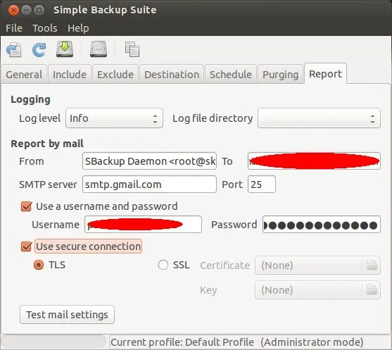 Report 是最后一个选项卡,在这里你可以设置接收备份完成通知的邮箱。输入你的邮箱ID、SMTP服务地址、邮箱用户名、密码后,点击 Test mail settings。需要留意的是,在测试邮箱设置前,点击工具栏中的Save Configuration按钮保存你的配置。