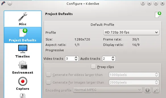 这是我的屏幕录像的设置:高清720p每秒30帧,1280×720的屏幕尺寸。如何知道该使用什么设置项? Google上有一些说明。设置这些值可到Settings > Configure Kdenlive > Project Defaults > Default Profile > HD 720p 30fps(图1)。
