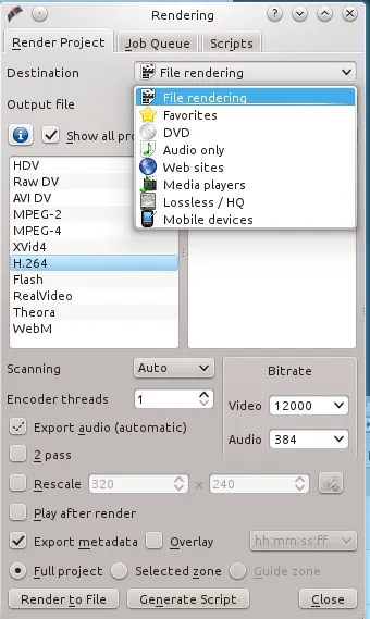 当你满意自己的编辑,并准备导出你的最终格式时,点击Render按钮。这需要几分钟的时间,取决于你的电脑速度和项目大小。已有为网站预先设定的值,如果你选择File Rendering, 你可以调整你的设置(图5)。我用File Rendering中的H.264,Video比特率12000, Audio比特率384取得了不错的效果。H.264是一种超压缩格式,使用这种格式发布的文件小但质量好。
