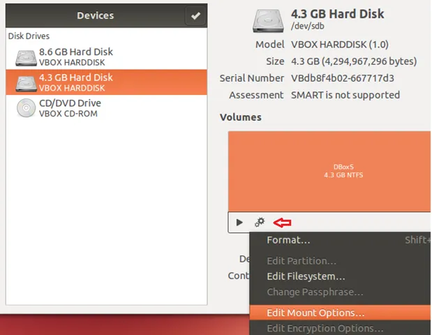 如果你发现自己也有类似的问题,无论是使用Windows还是Ubuntu,请按照下列步骤,以腾出本地磁盘上的空间。在Ubuntu中开始移动Dropbox文件夹,首先插入外部存储器。(译注:本例并非真实的外部移动硬盘,而是在vbox测试环境中测试。)