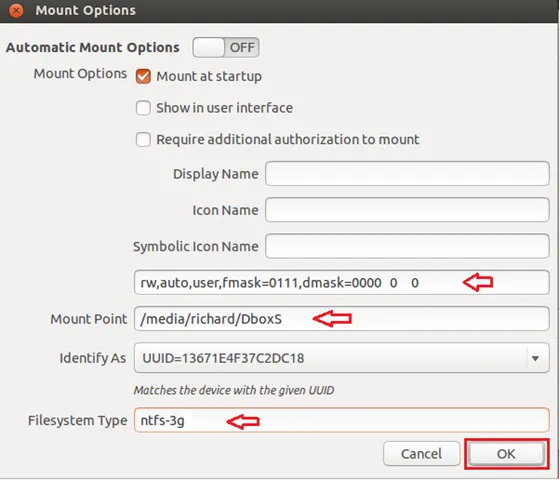 然后指定相应的选项,如下图所示:安装点(准备将Dropbox的文件夹放到这里),文件系统类型,以及下面的图片中的其他选项。保存它时,你就大功告成了。