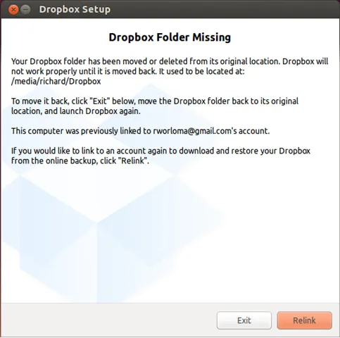 在此之后,退出Dropbox的服务并在默认位置(/home/用户名/Dropbox)删除当前的Dropbox文件夹(译注:在Dropbox完全移动好之前,我不建议你如本文一样删除原来的文件夹,而是将文件夹改名,要不万一出错呢?)。当您再次启动Dropbox的服务时,它会提醒你缺少的文件夹。点击重新链接按钮以指定新的位置(就是你的移动硬盘上的新位置)。
