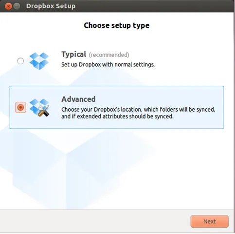 当提示选择安装类型,选择‘Advanced’并指定位置安装Dropbox文件夹。