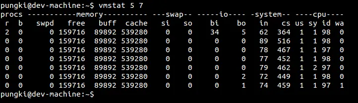作为一个统计工具,使用vmstat最好的方法是使用间隔时间。你可以间断地捕捉系统状态。让我假设以5秒的间隔运行vmstat。只需要在你的控制台中输入vmstat 5就行。