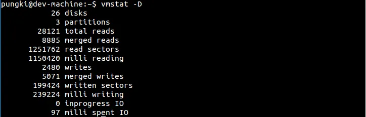 如果你想,vmstat也可以打印系统磁盘活动统计。使用-D选项就行。
