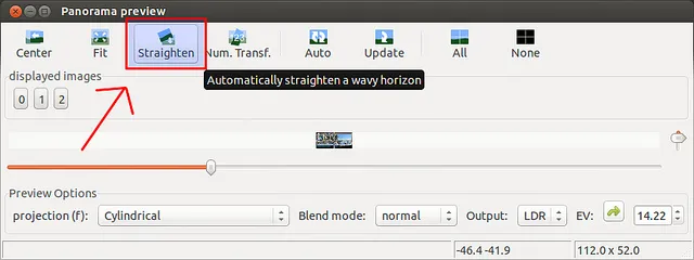 倘若合并的全景照片的水平线参差不齐,我们可以试图将它拉直。首先点击工具栏上的 Preview panorama 按钮。