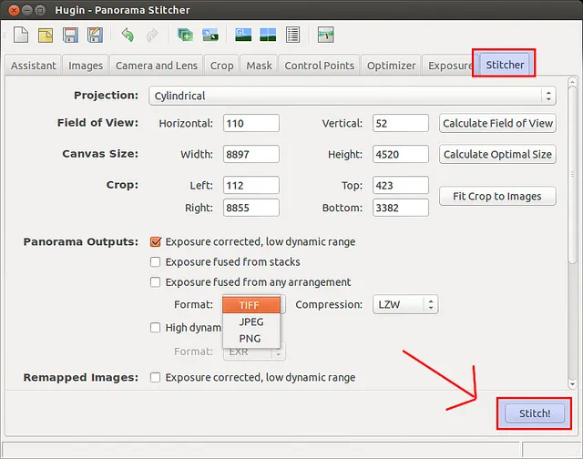 一旦你对合并的结果感到满意,你可以继续将它导出为图片文件。只需要到 Hugin 主窗口中 Sticher 标签页里进行下面的操作: