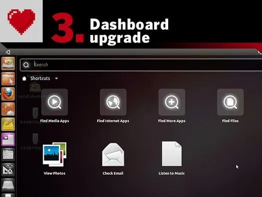 升级后的Dashboard: 为用户提供了搜索甚至是Ubuntu One cloud的Ubuntu Dash已经升级了。