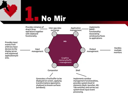 没有Mir: Unity界面还没有从X.org转移到Mir 编译器。这是让很多人失望的主要的地方。