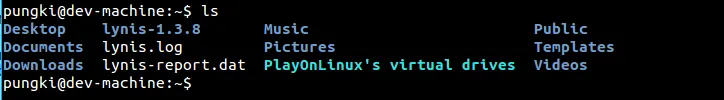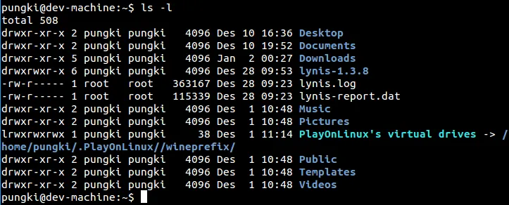 • 第一个字母d意味着内容是目录或者文件。在上面的截图中,Desktop、 Documents、 Downloads 和 lynis-1.3.8是目录。如果是’-‘(减号),这意味着它的内容是文件。当它是l(小写l字符),意味这内容是链接文件。