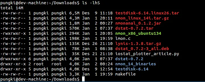 在我们可以显示文件大小之后,我们希望以文件大小排序。我们可以使用-S参数来这么做。这列表会从大到校排序。