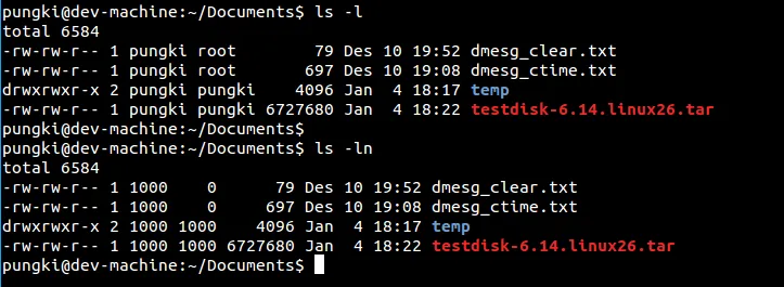 如果你想以数字方式列出项的所有者和所有组(即UID和GID),我们可以带-n选项使用ls命令。这里是个例子。