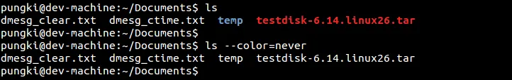 一些Linux发行版已经对ls命令启用彩色。这会使ls以各种颜色打印列表。如果你不想要这样,你可以使用 –color=never 参数。