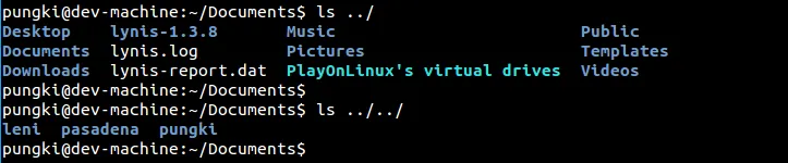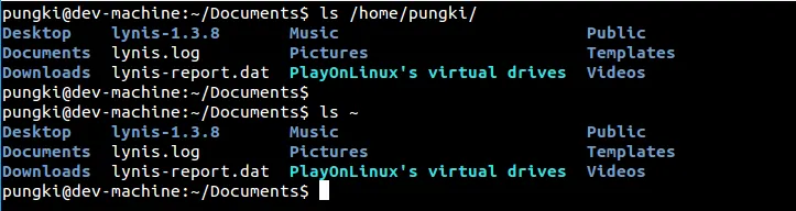 要列出你的主目录,你可以用”~”(波浪号)来代表它。这样你就不必输入完整的目录名。让我们假设家文件名为/home/pungki,那么波浪号就对/home/pungki有意义了。