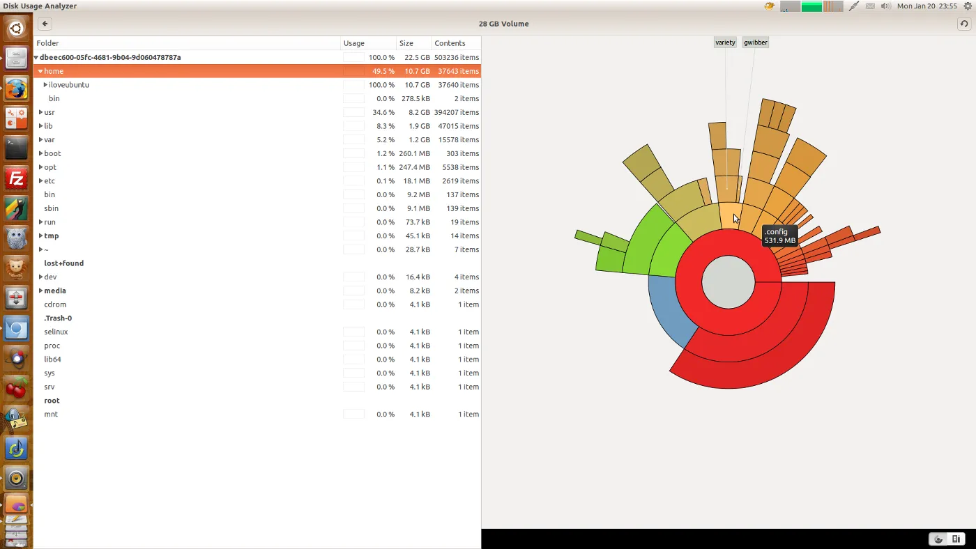 Ubuntu 13.10 默认自带磁盘分析器,一个允许用户快速并有效地通过简单的图形视图来查看占据磁盘的文件和文件夹的工具。