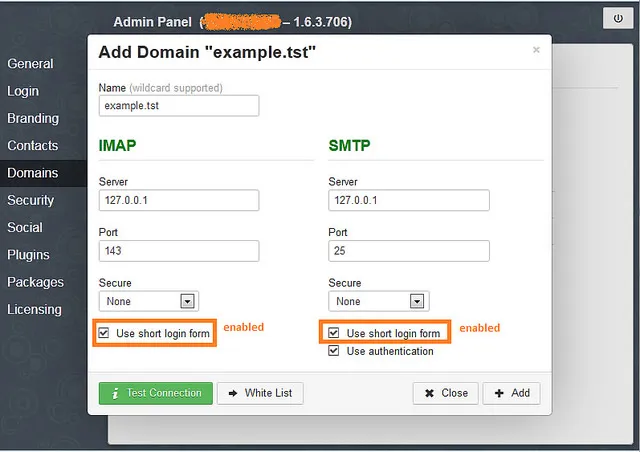 在 管理面板> 域> 增加域 页面设置有效的域。建议服务器 IP 是本地服务器,如 127.0.0.1。基于服务器配置,RainLoop 可以配置使用 IMAP/IMAPS 或 SMTP/SMTPS。并且,确认‘使用短登录表单’复选框已勾选。