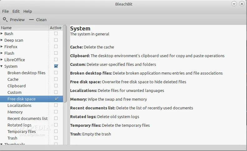 这是最容易的方法,建议初级用户使用。从你的 Linux 发布版本的默认软件源仓库中很容易的就可以安装 BleachBit 应用程序。打开它,请确保您在侧边栏上的系统部分选中“可用磁盘空间”选项。点击“清除”按钮开始执行。