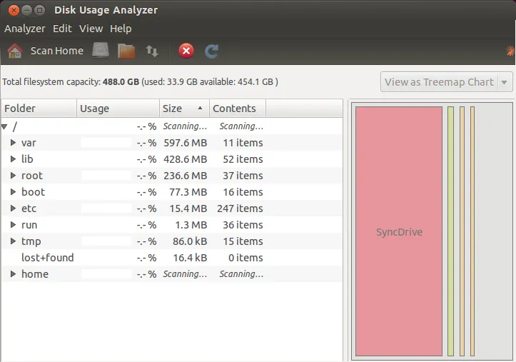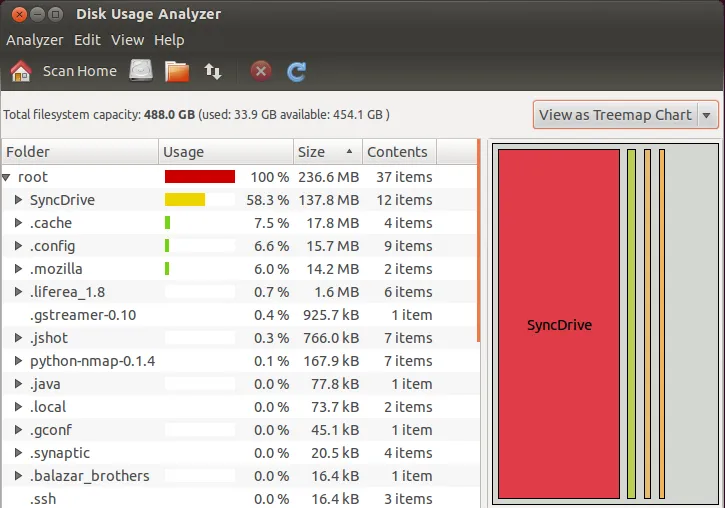 正如上图所见,baobab 扫描结果提供给我们很多信息,包括 Home 目录中每一个文件夹的使用情况、大小,以及所拥有文件数。右边有一个饼状示意图。如果你喜欢,选择上方的 View as Treemap Chart,你可以轻松地把它换成树状图。