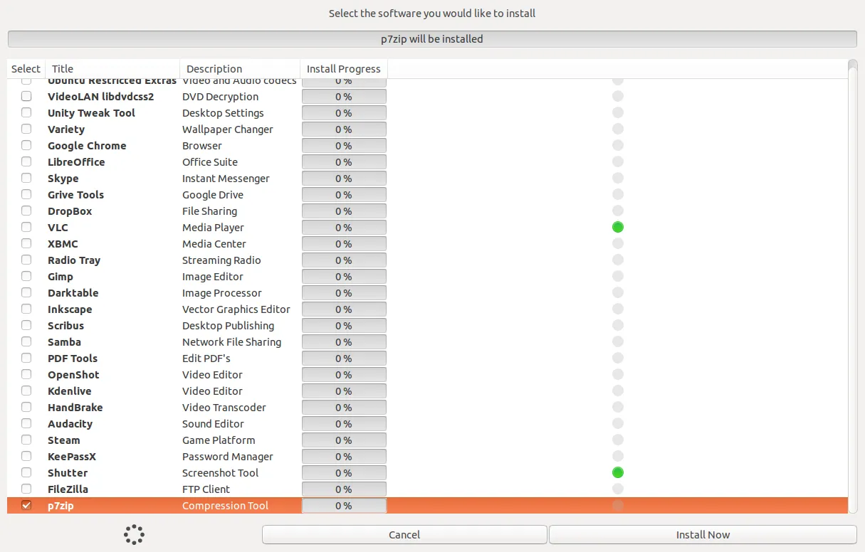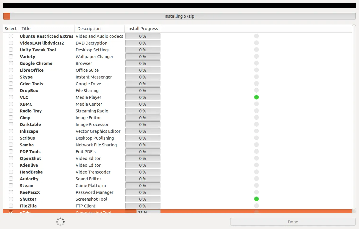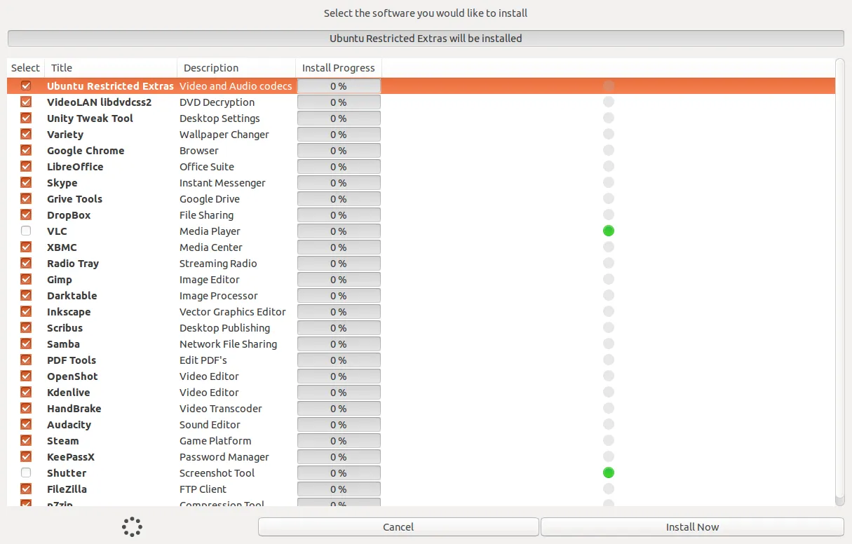 正如你在上面的截图中看到,它会显示所有有用的软件。已经被安装了软件会标有绿色的色点,且默认不会选中。如果某一款软件不适用于您的Ubuntu版本,那么它将被标记为红色圆点。还有,标志着橙色的软件则是需要重新安装和更新的。清楚了吗?