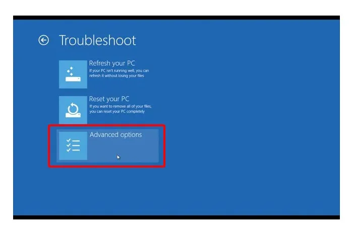 疑难解答菜单中,选择高级选项