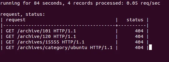 $ tail -f /var/log/apache2/access.log | ngxtop -f common