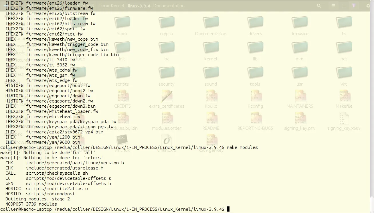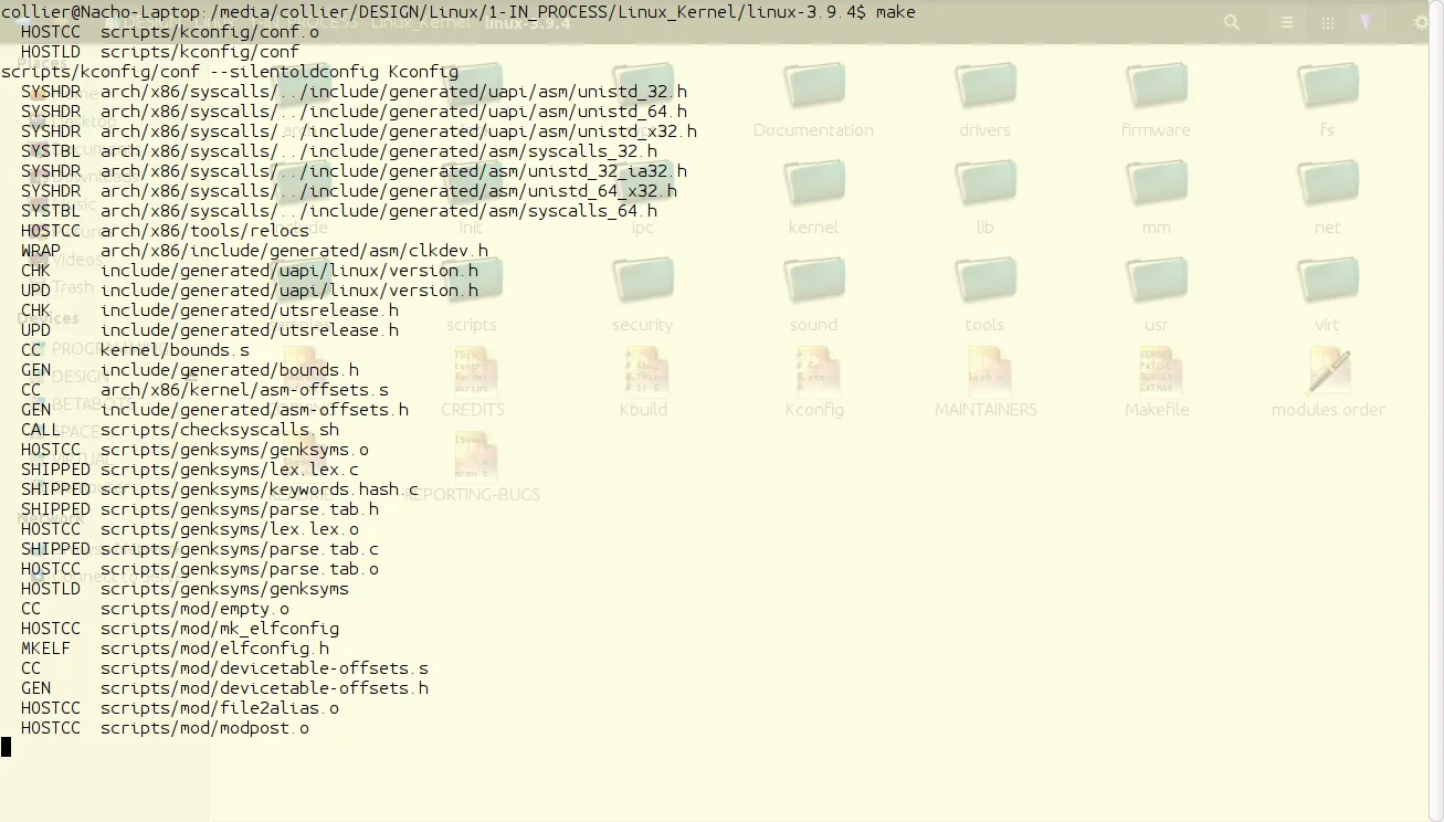 为了编译内核,在内核源代码相同目录下,在终端内输入”make”。这会花费一些时间。完成之后,必须通过”make modules”来编译模块。为了从一开始就简化编译过程,输入”make; make modules”。这会先编译接着是模块,而不用用户再回来输入”make modules”。