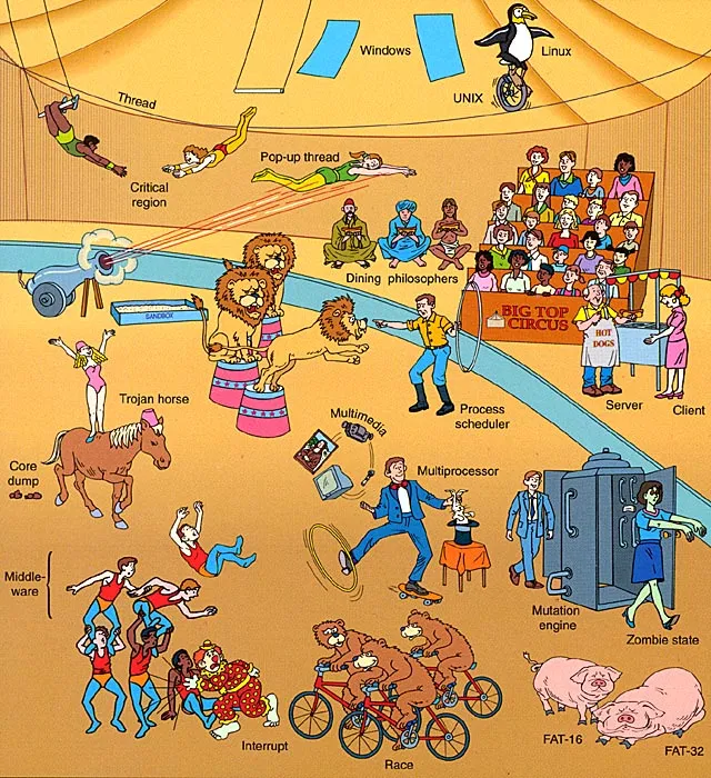 见到了一张趣图(看起来有点老),用一个马戏团来象征操作系统里面的那些事,大家可以看看~