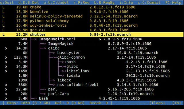 你可以在指定包上使用”r”键来显示其依赖关系,循环在指定包上按下”r”键可以展示出余下的信息。