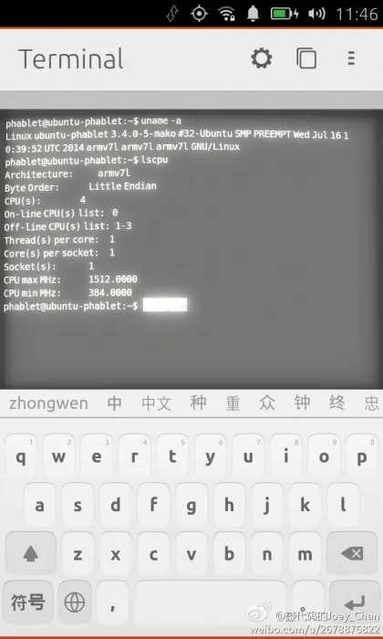ubuntu touch确实可以运行终端,使用shell命令,不过ubuntu touch用起来好卡,体验太差了,不知道出新版本了没有。之前nexus 5刷过之后就又删掉了。。体验太差。。 //@Linux中国:回复@i_Ricky:我觉得那是必须的,否则叫啥 Ubuntu,即便官方没有,肯定也会有第三方的 APP 出来,不见 IPHONE 都有 TERM么