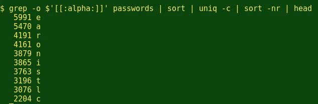 在 passwords 文件中出现最频繁的字母依次是EARONISTLC,类似于EAIRTONSLC,这是至少一个出版的表格中提到的常用英文单词中出现的字频。这是否意味着,大部分密码其实是一些常见的英语单词呢,也许会参杂一些数字呢?