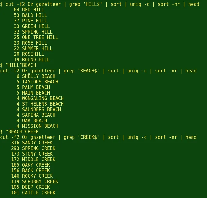 在之前的一篇Linux Rain article,我描述了如何建立一张37万项澳大利亚的地名表。有了它,我现在可以回答一些类似这样的关键问题“Round Hill是澳大利亚山脉中最流行的名字吗?”和“桑迪是沙滩之最,而岩溪峡谷呢?”