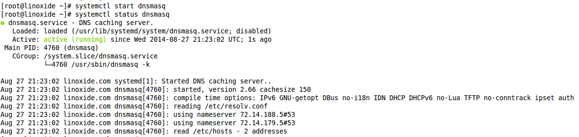 [root@linoxide ~]# systemctl start dnsmasq