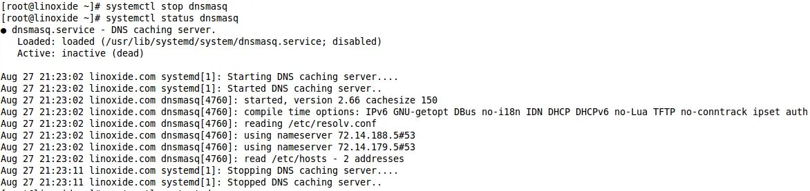 [root@linoxide ~]# systemctl stop dnsmasq