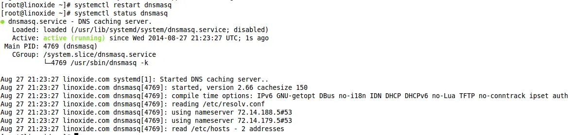 [root@linoxide ~]# systemctl restart dnsmasq