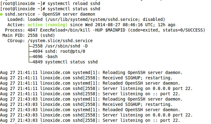 [root@linoxide ~]# systemctl reload sshd